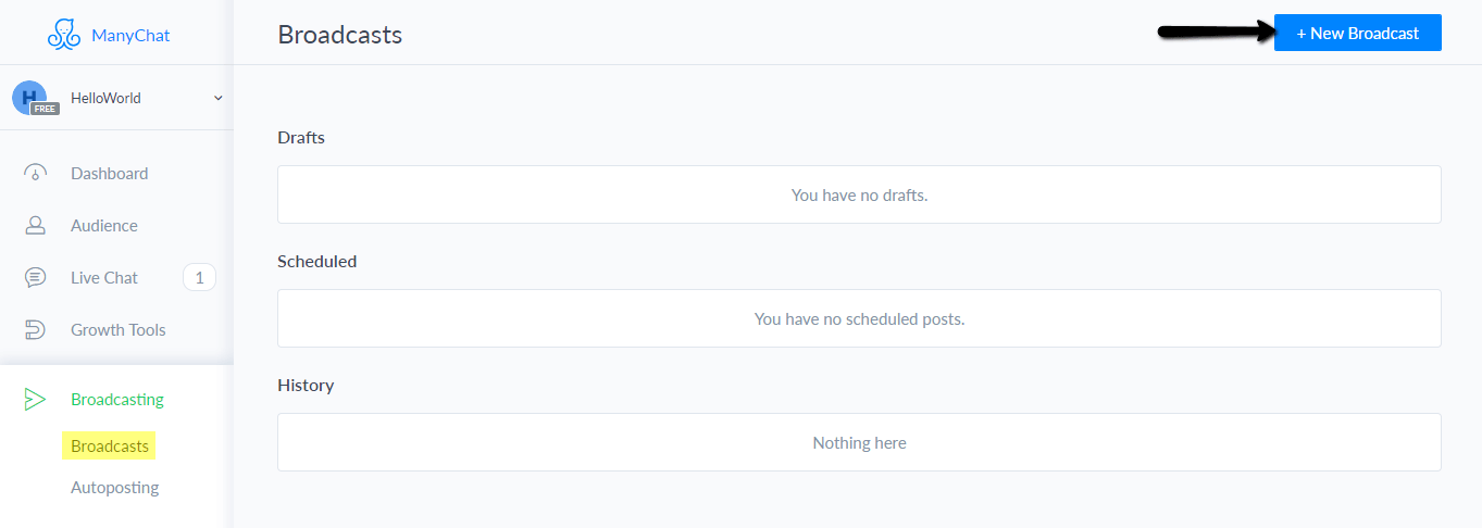 Dashboard -> Broadcasting -> Broadcast -> New Broadcast