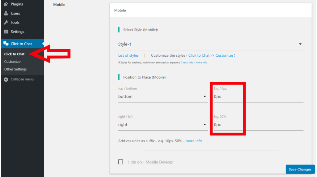 Navigate to Click to Chat – Style, Position, Select Style 1, and click Save.